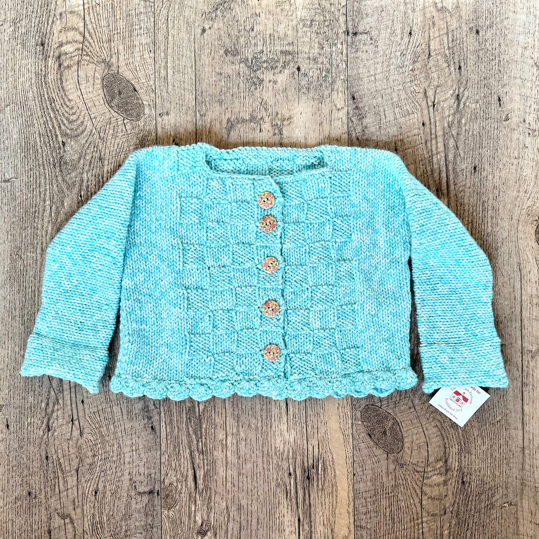 Hand Knit Aqua Cardigan Sweater with Floral Buttons