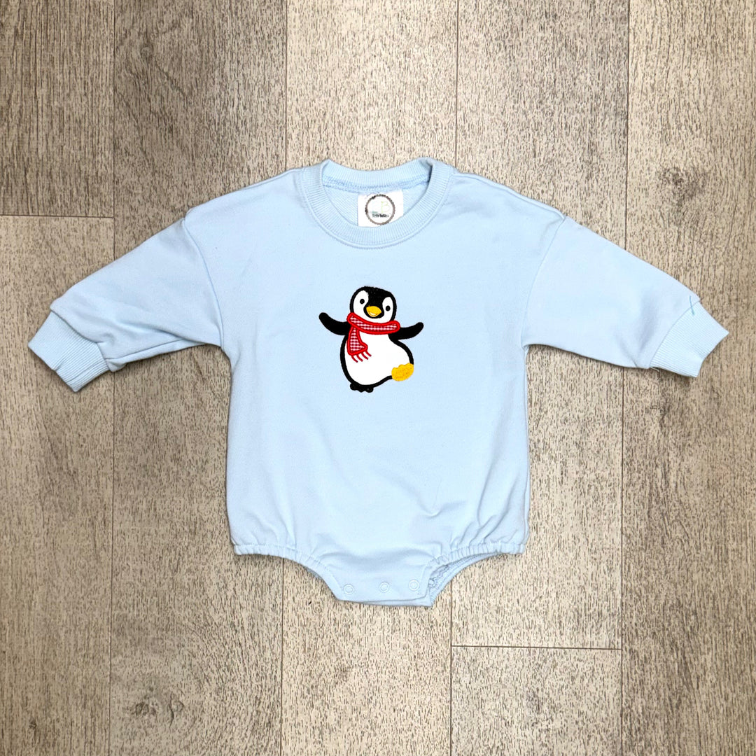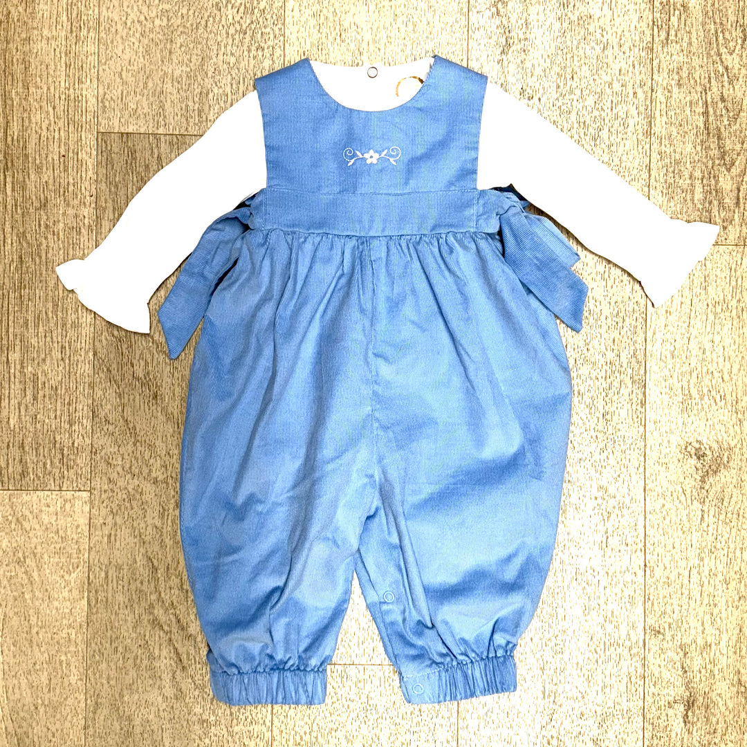 Handmade Blue Pinwale Cordoroy Coverall with Flower and White Ruffled Onesie