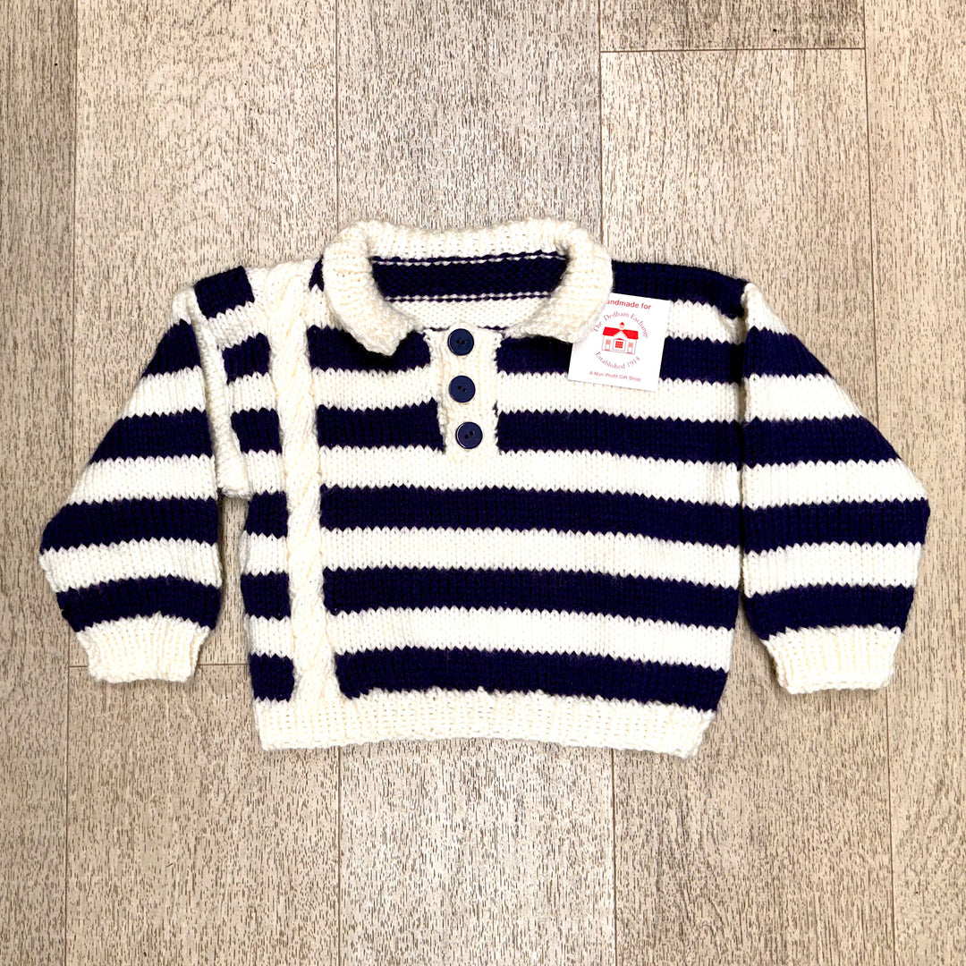 Hand Knit Navy and Off White Striped Pullover Sweater
