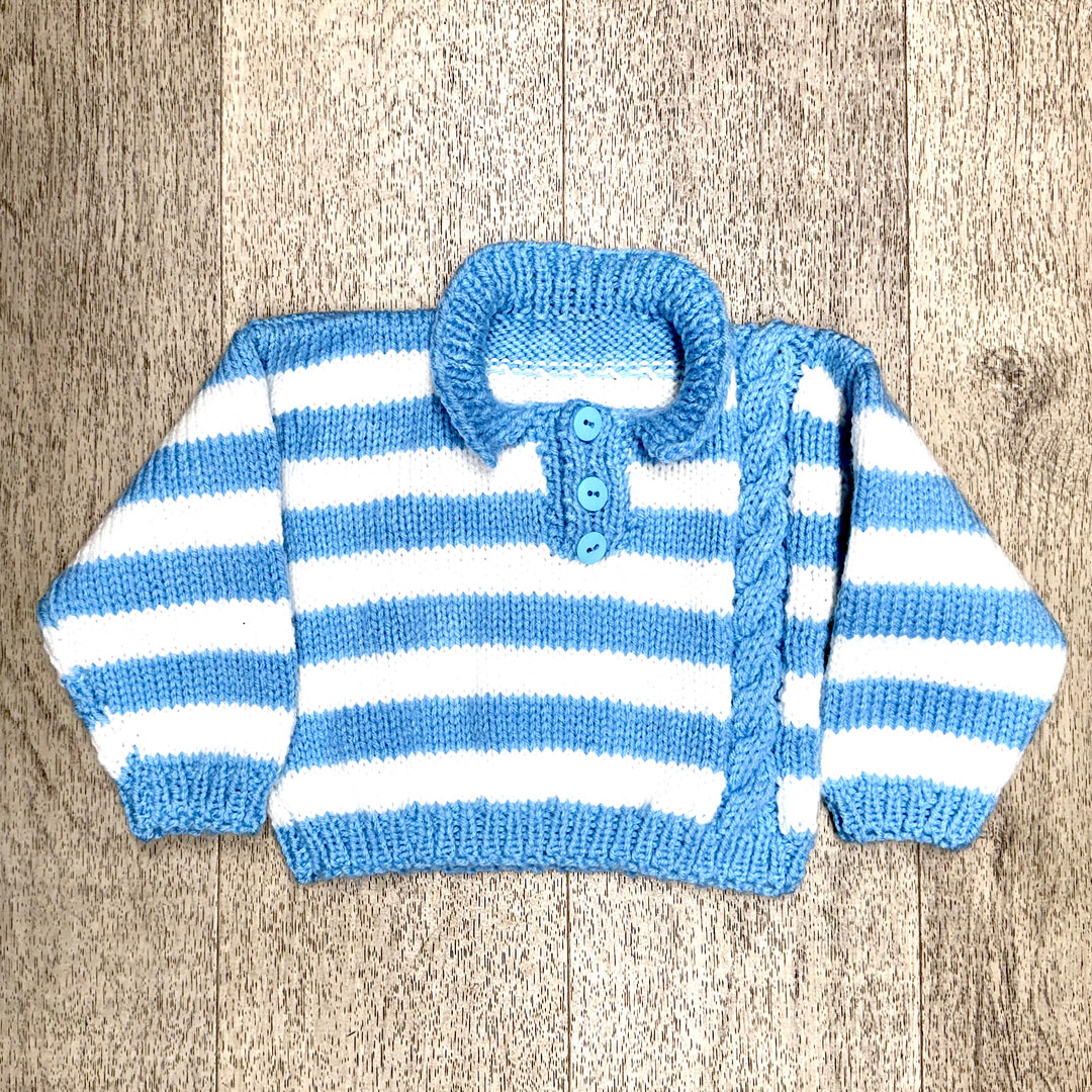 Hand Knit Blue and White Striped Pullover Sweater