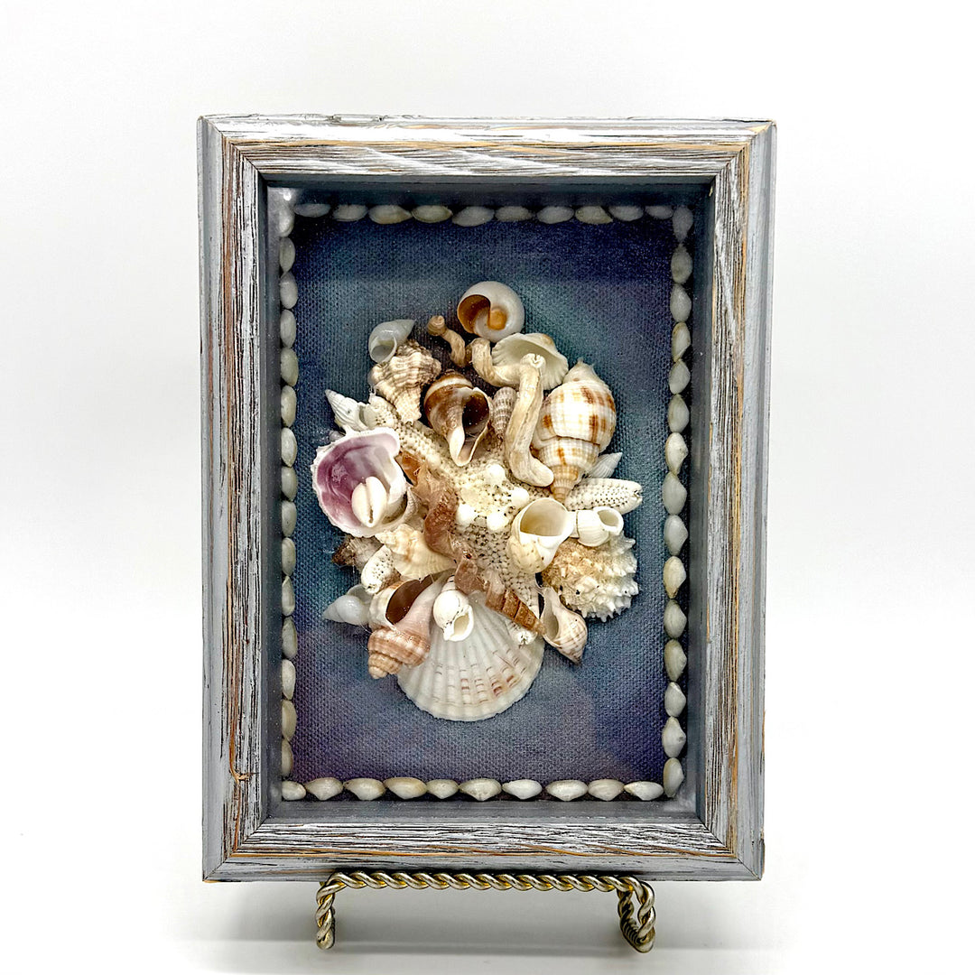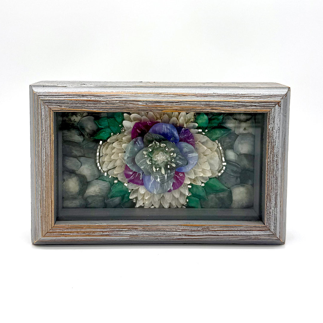Handcrafted Small Shell Shadowbox With Blue and Purple Flower Design