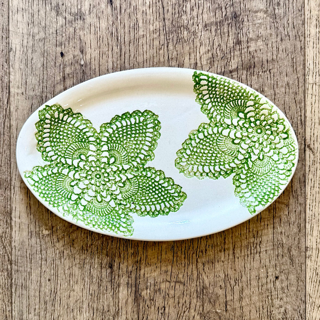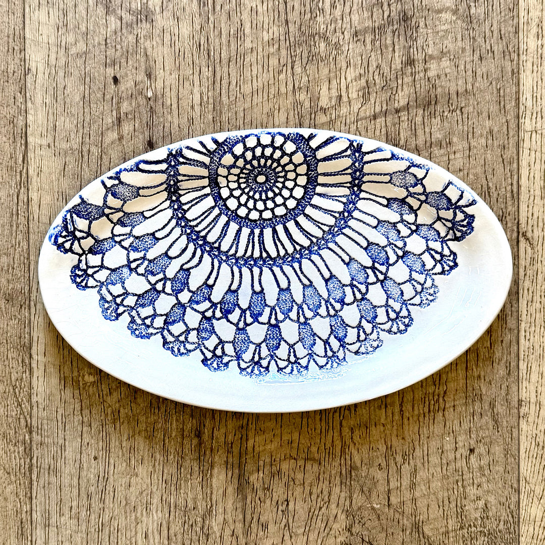 Handmade Small Oval Dish with Blue Lacy Pattern