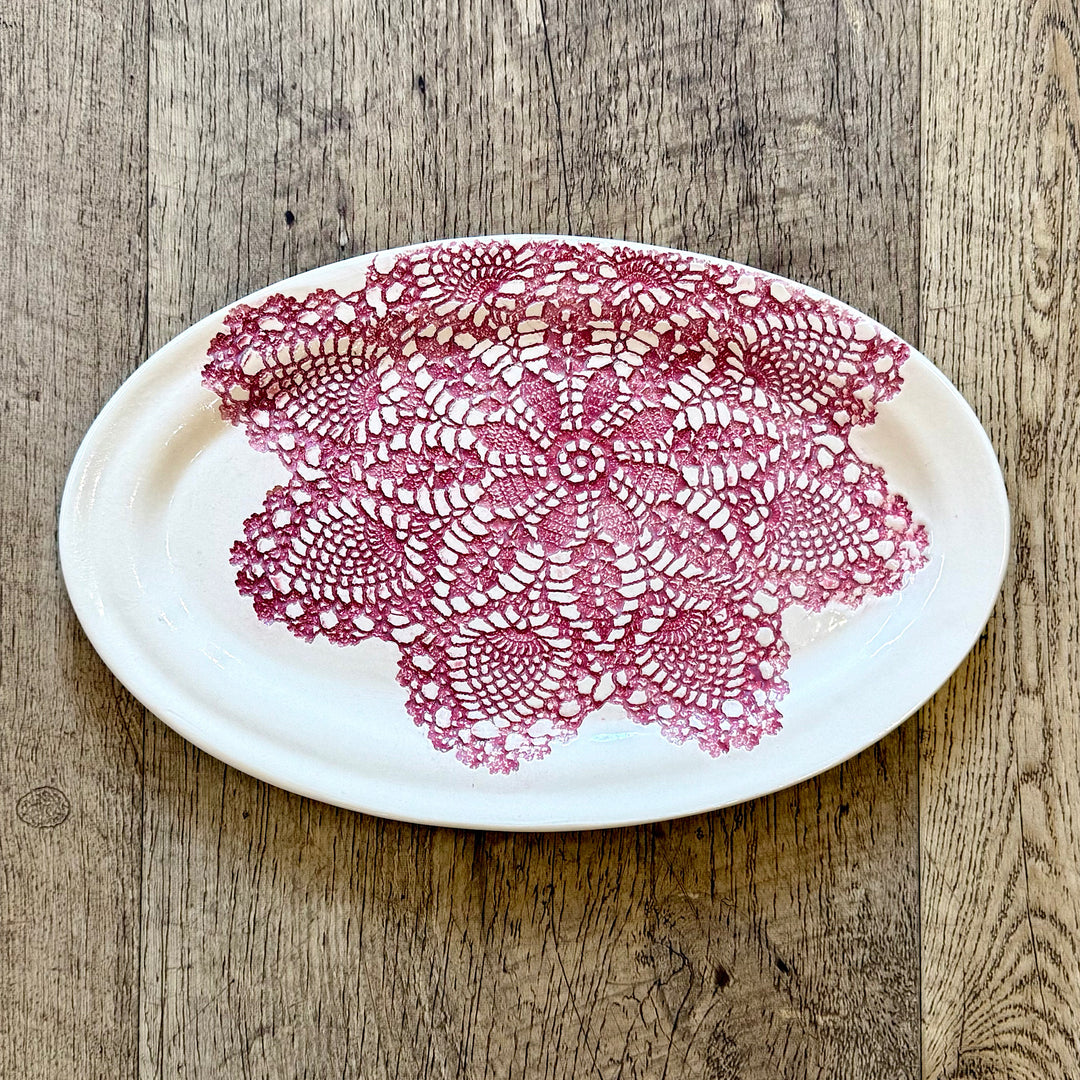Handmade Medium Ceramic Dish with Cranberry Lacy Pattern