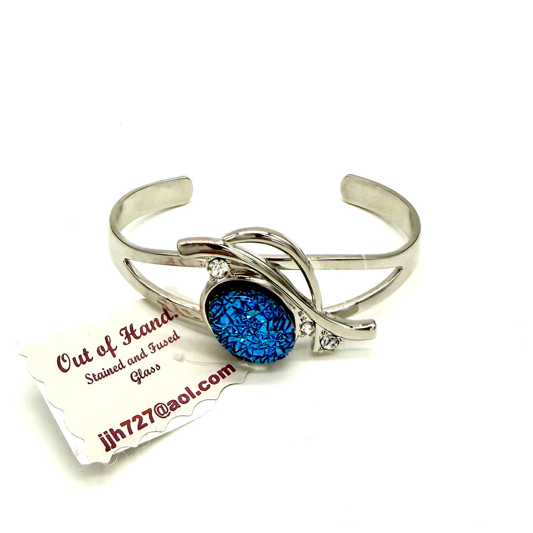 Handcraafted Cuff Silvertone Bracelet with Blue Fised Glass Decoration